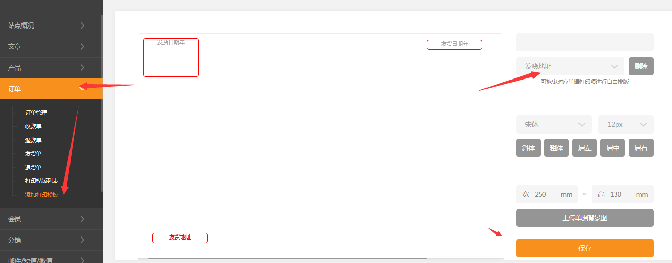 店主可以自己编辑、建立模板。本小节共包含2点。1、通过本部分的操作,您会对快递单模板有深入的了解!添加新快递单模板编辑快递单模板 一、添加新快递单模板1.依次点击 订单-》添加打印模板-》录入单据名称-》上传单据的图片会提示先上传新单据的图片图片最好用分辨率高的扫描仪进行处理,效果会更好。分辨率建议在96dpi左右图片上传结束后,根据图片中内容项位置添加相应打印项就可以。2、编辑快递单模板如果对快...