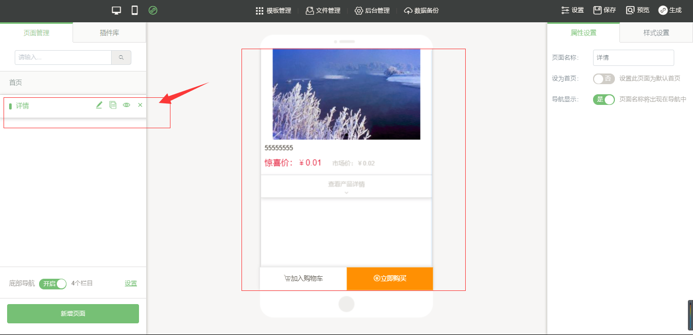 营销版及以上版本支持。1. 在小程序编辑器-产品详情中,点击“属性设置”选择“分享”,则可将该商品制作为海报进行分享,客户扫码后即可进入到该商品的产品详情页中,如图所示: